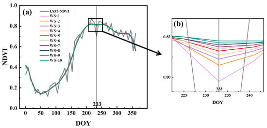 We calculated the EGF-NDVI time series curves based on different within 0–10. From Figure 9a, differences in can decrease the residual noise in the NDVI time series curves. The NDVI of DOY 233 is below normal due to cloud-detection errors. We observed that the impact of noise on NDVI diminishes as increases. When is set to 5, the NDVI time series curve can be effectively smoothed to remove noise and without overfitting the NDVI time series. Therefore, was chosen as the best parameter for the Whittaker smoothing filter in this study.