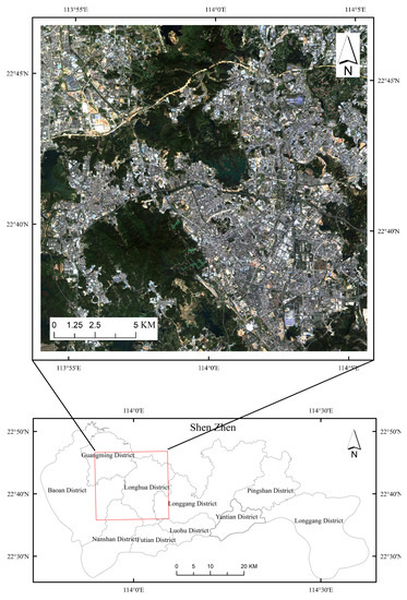 For our study, a portion of Shenzhen City was selected as our study area. Shenzhen City is one of the world’s most rapidly urbanizing cities and has been ranked as an “Alpha-” city by GaWC 2020 [34]. The study area includes an area of 113.90 E–114.09 E and 22.60 N–22.78 N, mostly belonging to Longhua, Longgang, Nanshan, Baoan, and Guangming districts, as shown in Figure 1.