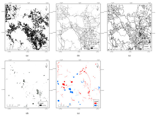 The maps of the datasets in this study. (a) POIs from Amap; (b) vehicle trajectory GPS points from Shenzhen Municipal Government Data Open Platform; (c) roads from OpenStreetMap; (d) buildings from OpenStreetMap; (e) impervious surface (IS) samples and pervious surface (PS) samples labeled from Google historical images for model validation and testing, which contain various surface coverage types, such as vegetation, water, roads, and buildings.