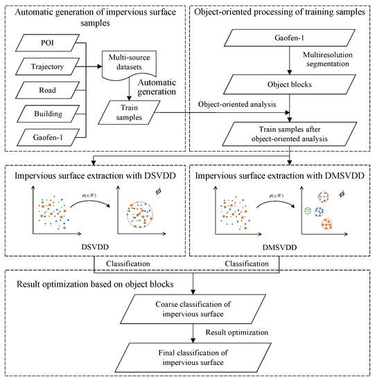 In this paper, an object-oriented automatic extraction method of impervious surface based on DMSVDD is proposed. The technical flow chart of the proposed method is shown in Figure 3. The method consists of five parts: (1) automatic generation of impervious surface samples, which integrates multiple open geographic datasets to generate impervious surface samples; (2) object-oriented training sample processing based on multi-scale segmentation results; (3) construction and training of DSVDD based on single sphere for impervious surface extraction; (4) modeling DMSVDD algorithm for impervious surface extraction that takes into account the diversity of impervious surface types; (5) optimization of impervious surface extraction results based on object blocks.