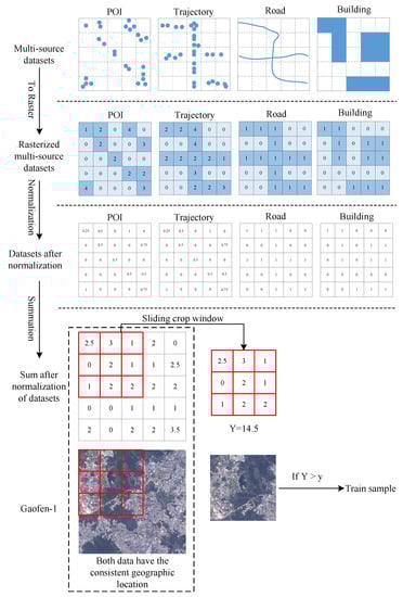 The more open geographic data generated on impervious surfaces in a certain area, the higher the probability that the area is covered by impervious surfaces. However, due to the users’ opportunistic observation efforts, it is inevitable that there exists spatial bias in open geographic data, especially in data shared by ordinary people [36,37,38]. To address this issue, a threshold method is used to filter the generation of impervious surface samples (Figure 4). Firstly, maximum–minimum normalization is implemented to compress the frequencies of various multi-sourced open geographical data to the interval [0, 1]. Secondly, a sliding window is used to crop the normalized frequency data and remote sensing data. The size of the cropped block is determined based on the network structure of the model. In our paper, the cropped block size is 14 × 14 pixels, and the coverage area is 28 m × 28 m. Thirdly, for each cropped block, its total pixel values are computed and noted as Y, and then a threshold y is set. If Y is not less than the threshold y, then this block has a high probability of being an impervious surface. All pixel blocks that meet the threshold requirements will be used as impervious surface samples to train the impervious surface model.