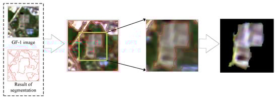 Object-oriented analysis techniques can segment remote sensing images into geographical objects as the basic processing unit. In our experiments, we used eCogition software (version 9.0, Trimble Germany GmbH, Munich, Germany, 2014) to segment remote sensing images. The eCogition software is currently one of the most popular tools for image segmentation [39]. For each filtered sample, we performed an object-oriented process, as follows (Figure 5): (1) If the sample block contains only one object block, the sample is used directly for model training; (2) if the sample contains more than one object block, only the image spectral data of the largest object block are retained, while the other regions within the sample are filled with zero values. These samples processed by the object-oriented method are used to train the model.