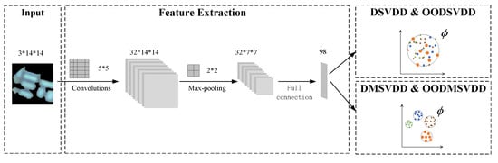 To determine whether a test sample belongs to the positive or negative class, the DSVDD approach calculates the anomaly score of the sample using Equation (2), where is the weight matrix of the trained neural network.