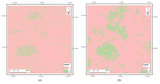 Impervious surface extraction results. (a) Coarse impervious surface extraction results for the study area; (b) final impervious surface extraction results after object-oriented correction for the study area.
