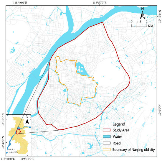 Nanjing, the capital of Jiangsu Province, is located in the middle and lower reaches of the Yangtze River in Eastern China. It has a total area of 6587.02 square kilometers. As one of the four ancient capitals of China, Nanjing has rich cultural relics and a unique natural landscape, and it is a key scenic tourist city in China. In 2019, Nanjing received 146.82 million domestic and international tourists, and its total tourism economic income was 278.495 billion yuan, ranking among the top tourist cities in China. The main urban area of Nanjing is the core area of the overall development of Nanjing, and it has a total area of approximately 259 square kilometers. The main urban area of Nanjing includes Xuanwu Lake, Mochou Lake, Confucius Temple, and other famous scenic spots in Nanjing. As an area with a high residential population density, the main urban area of Nanjing is a highly active area for urban tourism and residents’ leisure activities. Therefore, the main urban area of Nanjing is chosen as the study area (Figure 1).