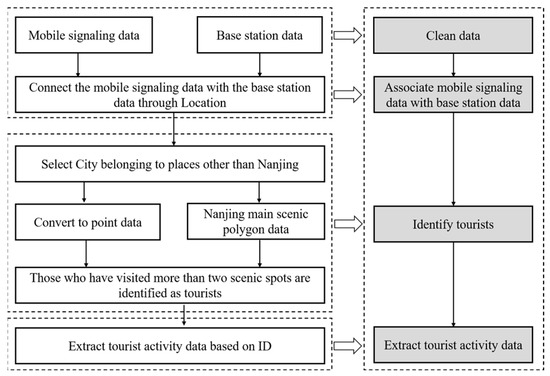 The tourists referred to in this paper are non-native tourists who carry out tourism activities in the main urban area of Nanjing. The process of the tourism activity data extraction is shown in Figure 2. To identify tourists, first, the PostgreSQL database of mobile phone signaling data is associated with the data table of the mobile phone identification number. Then, the province and city information of the mobile phone users is obtained to identify people from places other than Nanjing and local people. Subsequently, given that the activities of users who use out-of-town numbers in Nanjing include not only tourism but also business travel and medical treatment, we overlay the point surface space on the polygonal surface element layer of the city’s main scenic areas. Non-local-number users who visited scenic areas more than twice in one day are recognized as tourists. Then, the tourist activity data set is extracted through the ID code of tourists [40].