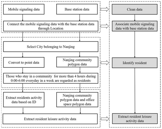 The process of the resident leisure activity data extraction is shown in Figure 3. To complete the extraction of the leisure activity data of residents, it is necessary to identify residents. Firstly, the mobile phone numbers which belonged to Nanjing are extracted using the City value. Secondly, the users who stay in a Nanjing community for more than 4 h during 0:00–6:00 every day for a week are regarded as residents [41]. Then the resident activity data are extracted based on the ID code of residents. Subsequently, depending on the community and the office space in the main urban area of Nanjing, the residents’ leisure activities which are outside of these two areas are extracted. Then, GCLQ and LCLQ analyses were performed on the acquired data sets using ArcGIS Pro software.