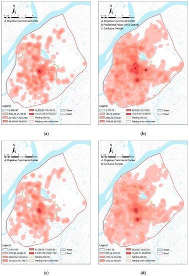 Kernel density estimation heatmaps of tourists’ activities and residents’ leisure activities in the main urban area of Nanjing. (a) Residents’ leisure activities on 17 November 2015 (weekend); (b) tourists’ activities on 17 November 2015 (weekday); (c) residents’ leisure activities on 21 November 2015 (weekend); (d) tourists’ activities on 21 November 2015 (weekend).