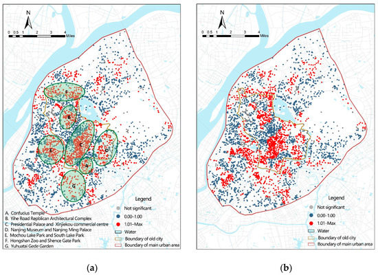 The LCLQ is used to analyze the clustering areas of residents’ leisure activities and tourists’ activities on a weekday (17 November 2015) and the weekend (21 November 2015). As shown in Figure 5, on weekdays, the number of spatial correlation points for residents’ leisure activities and tourists’ activities accounts for 36.17%. The number of spatial correlation points increased slightly from morning to noon and decreased in the afternoon and at night on weekdays. The correlation areas are relatively stable in different periods, mainly concentrated in famous scenic spots and the commercial center within the old city of Nanjing, such as the Presidential Palace, Confucius Temple, and Xinjiekou commercial center, and other areas in the main city, such as Nanhu Park and Yuhuatai Gede Garden. Furthermore, some spatial correlation points are dispersed throughout the neighborhood hotels, supermarkets, etc.