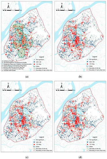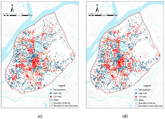 Results of the LCLQ of tourists’ activities and residents’ leisure activities on 17 November 2015 (weekday). (a) Results of the LCLQ in the morning (9:00–10:59); (b) results of the LCLQ at noon (11:00–13:59); (c) results of the LCLQ in the afternoon (14:00–17:59); (d) results of the LCLQ at night (18:00–22:59).