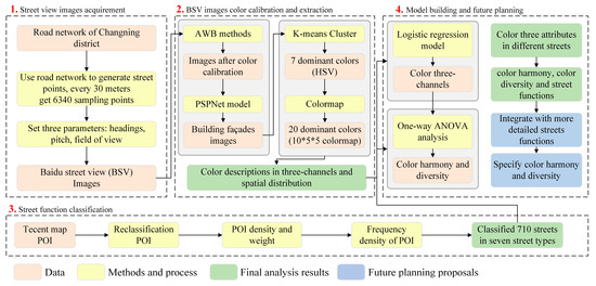 Our study included four main parts, as described in Figure 1. First, we obtained street view images of Changing District. Second, we used AWB methods to calibrate the images and extracted the building façades’ dominant colors by K-means clustering, by which we preliminarily described the colors in three channels and determined the spatial distribution. Third, street functions were identified based on the frequency density of point of interest (POI) data. Finally, we explored the relationships between the building color distribution, color harmony, color diversity and street functions using a logistic regression model and one-way ANOVA.