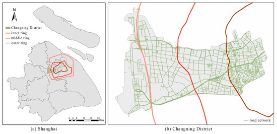 This study was conducted in Changning District, Shanghai, China, as shown in Figure 2. Shanghai is the second-largest city in China, with an area of approximately 6340.5 km2 and 24.9 million people. Changning District is located in the central district of Shanghai; it covers an area of 37.2 km2 and had a population of 0.6 million people by the end of 2022 (Shanghai Municipal Statistics Bureau, 2022). Changning District is one of the central districts of Shanghai. The geographical conditions in Changning are representative; it has a longitudinal range from 121°26′01″ to 121°19′36″ E (WGS84 Universal Mercator Projection) and is characterized by a mild and humid climate, with an annual mean temperature of 19 °C. Suzhou River runs to the east and west of the area. Changning District’s streets differ in color, types and features, and they could be a representative example of Shanghai’s streets. Changning’s streets are located across the inner ring, the middle and the outer ring of Shanghai. There are also historical blocks, as well as the Shanghai Hongqiao International Airport, in Changning District. The use of Changning District as a typical case for urban façade color description and analysis can guide future urban color planning.