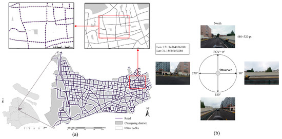 We used semantic segmentation techniques to obtain buildings based on a large number of street view images and identified their main colors. Street view images of the same areas were usually taken at the same time sequentially, which could ensure the consistency of daylight, as well as simulating people’s visual perception when walking along streets [38]. We obtained Baidu street view (BSV) images utilizing the application program interface (API) from the Baidu Maps open platform (https://lbsyun.baidu.com/) [39] in September, 2022. The digital photographs were acquired from the BSV API with a resolution of 480 by 320 pixels. The process of crawling street view images included three steps; we simplified the route of the road network into a single line using ArcGIS [40]. We obtained the images at the distance of 30 m along the roads. In total, 7050 sample points on 752 roads were included, as seen in Figure 3a. Second, the WGS84 coordinates of the road network were converts into BD09 to ensure the location’s accuracy. We captured the BSV images based on the latitude and longitude coordinates of the sampling points. All the image parameters were set as follows: headings = (0°, 90°, 180°, 270°), field of view = 90°, pitch = 0. These simulated the visual perception of pedestrians horizontally in four directions on the street [41], as shown in Figure 3b. A total of 26,151 images were crawled. Third, 800 images of the city’s elevations and tunnels were excluded. Finally, we used 25,337 images (6340 sampling points) to identify building façade colors. As some streets had no buildings, 6276 sampling points were included in the color analysis.