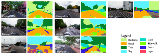 This study used the trained PSPNet recognition model based on the ADE20K dataset to semantically segment the Baidu street view images [42]. The model’s accuracy (mIoU) rate was 85.4%; thus, it could ensure high accuracy in building façade identification. Semantic segmentation required classifying each pixel into a given set of categories [43]. Each pixel was classified into a category, such as building façades, trees, sky and sidewalks, as seen in Figure 4.