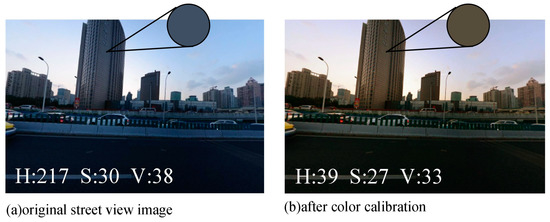 Sunlight, illumination and reflectance can significantly influence the colors captured in street view images. Therefore, color calibration was necessary. The method of automatic white balancing (AWB) can estimate illuminance and calibrate the image color automatically; thus, it is widely applied [44]. This method utilizes various algorithms based on different situations, such as the white patch, gray world, iterative white balancing, illuminant voting and color by correlation algorithms [45].