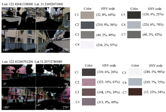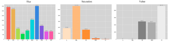 In total, 657 streets with 6276 sampling points were included in the analysis, and streets without street view images were excluded. For each sampling point, we identified the three most dominant colors. In HSV mode, the color hue is divided into ten categories based on the Chinese color system [49], resulting in five basic colors of red (R), yellow (Y), green (G), blue (B) and purple (P) and five intermediate colors of red–yellow (YR), yellow–green (GY), green–blue (BG), blue–purple (PB) and purple–red (RP). Saturation is divided into low saturation (L), medium–low saturation (ML), medium saturation (M), medium–high saturation (MH) and high saturation (H) [50]. The saturation’s corresponding numerical values are 0–2, 2–10, 10–30, 30–60, 60–100. The value of colors is divided into 5 groups, including 0–26, 26–51, 51–89, 89–140, 140–255.