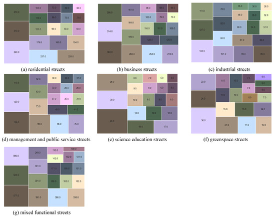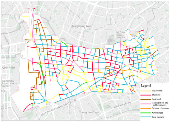 We classified 710 streets into different functions, as seen in Figure 7. Among them, there were 151 residential streets (20.08%), 169 business streets (22.47%), 73 industrial streets (9.71%), 67 management and public services streets (8.91%), 20 science education streets (2.66%), 8 greenspace streets (1.06%) and 224 mixed functional streets (29.79%).