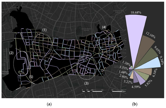 Spatial distribution of street color in Changning District. (a) Colors’ spatial distribution; (b) Top 15 dominant colors.