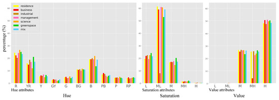 We also explored the relationship between three color attributes and street functions. Industrial streets have a lower red hue. Science education streets also have less red–yellow (YR) than other functional streets. The proportion of red–yellow (YR) in greenspace streets is the most compared to other functional areas. The saturation of industrial streets is mainly low, while it is mostly medium–low (ML) in other functional areas. The values of commercial areas are high (H) and medium (M), with the least colors in the medium–high (MH) category. The values of other functional areas are mostly high (H), as seen in Figure 11.
