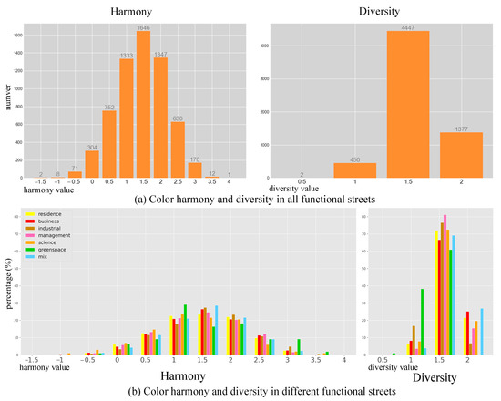 Color harmony and diversity in (a) all functional streets; (b) different functional streets.
