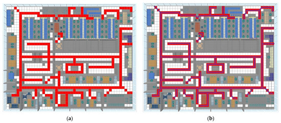 Table 3 displays the results of the experiments, including the length of the generated shortest route, the length of the real shortest route, and the precision of the trial outcome. The accuracies were all higher than 81%, with the highest precision of 96.11% achieved for the two POIs from the entrance to a hallway in the school’s architecture. Notably, the accuracies of the two POIs from the entrance to a hallway were the highest among all scenarios, possibly because the accessible grids from the entrance to a hallway are usually more regular than in other scenarios. On the other hand, the cross-floor POIs had the lowest accuracies in all three architectures, likely due to errors inherited from the cross-floor architectural components. Nevertheless, the accuracies were all higher than 81%. The average accuracies of the three architectures were 88.17%, 86.64%, and 86.05%, respectively, all of which were higher than 86%. These results suggest that the image thinning technique can obtain accurate navigation networks from grid-based maps.