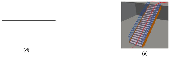 Figure 16 illustrates the 3D topological map generation of a straight ramp. Figure 16a,b display the 3D shapes and the top-down projection image of the straight ramp obtained from the design tool. Figure 16c,d represent the binary image and the 2D thinned topological map generated via projection thinning. The 2D thinned topological map is a straight line that accurately describes the accessible route of the top-down projection image. Upon intersection with the 3D shapes, the final 3D topological map is achieved. Figure 16e depicts a concrete example of the 3D topological map of the straight ramp, which appears at the center surface.
