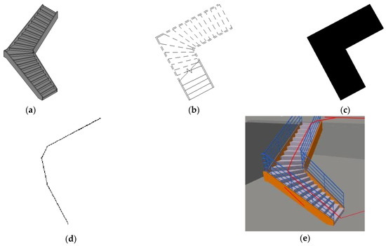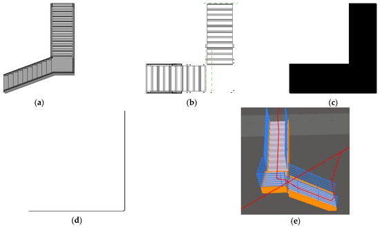The L-style staircase differs from the turn staircase in that it includes a transit platform, which is typically a slab represented by an IfcSlab instance. Moreover, the turn in the L-style stair is typically a right angle of 90°. An IfcStair instance in the L-style staircase typically comprises two IfcStairFlight instances and one IfcSlab instance, which connects the two flights. Figure 11 demonstrates the process of generating a 3D topological map from an L-style stair. Figure 11a is an L-style stair, whose top-down projection image captured from the design tool is shown in Figure 11b. Figure 11c,d are the binary image and the 2D topological map generated via the projection thinning process. Figure 11e is the final 3D topological map in a concrete house model. The 2D topological map is consistent with the top-down projection image, and the 3D topological map is able to propose a rational route.