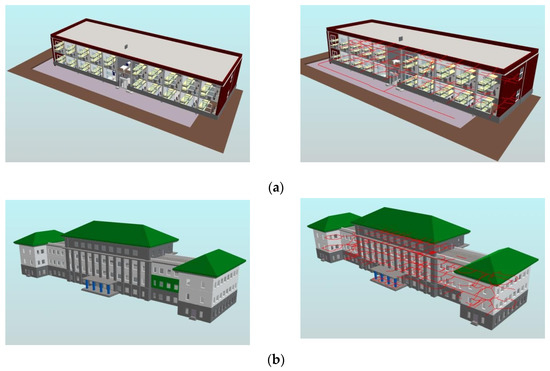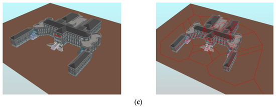 Test of BIM and indoor paths generated by GINIT: (a) two-floor dormitory; (b) four-floor school building—research; (c) Peking University People’s Hospital.