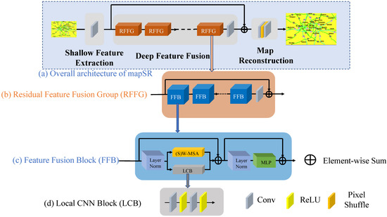 Map content is always represented by features at global and local scales. Global features mainly refer to the overall color distribution and brightness of the map, while local features mainly refer to the texture, edges, and corner details in the map. These features would be critical for reconstructing map text, map symbols, map scenes, and other map elements. We propose a network (mapSR) for super-resolution reconstruction of low-resolution maps, which integrates the global and local information of maps. The network combines the global and local information extracted by Swin Transformer and CNN, respectively. The specific structure is shown in Figure 1a. The proposed model consists of three modules: a shallow feature extraction module, a deep feature fusion module, and a map reconstruction module. The shallow feature extraction module focuses on employing convolutional and pooling layers to extract the features from a raster map. The deep feature fusion module uses the residual feature fusion group to fuse the global and local features of the map. Based on the fused features, the map reconstruction module exploits Pixel-Shuffle for generating the super-resolution result.