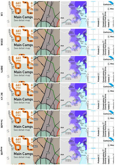 Moreover, the differences between visual and quantitative evaluation are worthy of discussion. In the results of image super-resolution, the quantitative results generated by PNSR and SSIM were generally similar to the visual results. In this manuscript, we found that the results of these two evaluations were different to a degree. The task of image super-resolution mainly focuses on reconstruction regarding the authentic degree of visual recognition, including color, texture, etc. In the task of map super-resolution, the reconstruction of geospatial information (etc. map text characters) is also a critical concern, in addition to the degree of visual recognition. As shown in Figure 7, the text results generated by SwinSR were still difficult to visually recognize, although the quantitative evaluation deemed these results allowable.