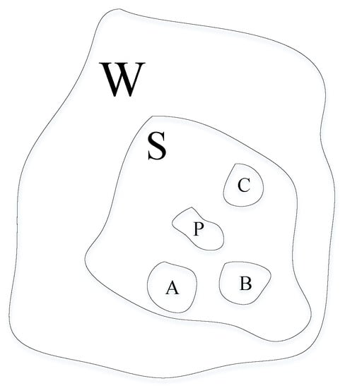 If [2021-03, P] is used as the selection condition, all these transactions cannot be filtered out due to mismatch. However, considering the spatiotemporal implications of their descriptions, these data then have relevance to the search criteria. There is a clear multiscale character to the time items. By further understanding, the range of each location is shown in Figure 1. There are scale differences in the space column in Table 1 space item W contains space item S, while S contains space items A, P, C and B.