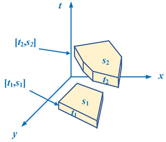 The time and space items include the spatiotemporal information associated with the attribute items. By mapping the time items to realistic time ranges and the space items to realistic spatial ranges, the spatiotemporal transactions satisfy the essential conditions for conducting spatiotemporal analysis. As shown in Figure 2, it can be observed that [t1, s1] is disjointed from [t2, s2], and the length of t1, t2 and the area of s1, s2 can be calculated. Therefore, objects or events located in [t1, s1] and [t2, s2] can be considered unrelated.