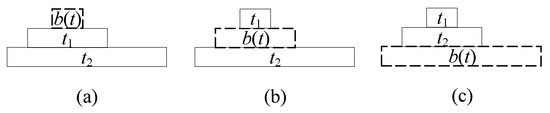 Three examples of temporal intersection relationships: (a) R(b(t) ≤ R(t1) ≤ R(t2); (b) R(t1) ≤ R(b(t) ≤ R(t2); (c) R(t1) ≤ R(t2) ≤ R(b(t)).