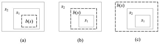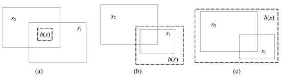 Three examples of spatial intersection relationships: (a) R(b(s)) ≤ R(s1) ≤ R(s2); (b) R(s1) ≤ R(b(s)) ≤ R(s2); (c) R(s1) ≤ R(s2) ≤ R(b(s)).