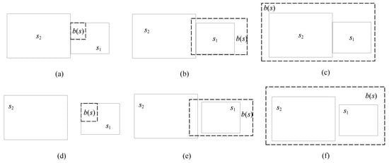 Examples of spatial adjacency and disjointedness: (a) s1 is adjacent to s2, R(b(s)) ≤ R(s1) ≤ R(s2); (b) s1 is adjacent to s2, R(s1) ≤ R(b(s)) ≤ R(s2); (c) s1 is adjacent to s2, R(s1) ≤ R(s2) ≤ R(b(s)); (d) s1 is disjoint from s2, R(b(s)) ≤ R(s1) ≤ R(s2); (e) s1 is disjoint from s2, R(s1) ≤ R(b(s)) ≤ R(s2); (f) s1 is disjoint from s2, R(s1) ≤ R(s2) ≤ R(b(s)).