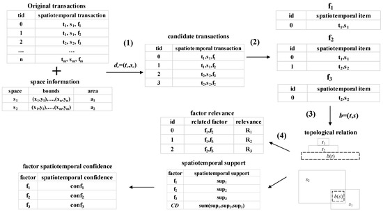 In the era of big data, spatiotemporal data exhibits the characteristics of multi-source heterogeneity. After processing, it can be transformed into structured data in the form of [“time”, “space”, “attribute1”, “attribute2”,…]. This structured data bears similarities to transactions and can be effectively mined using association rules [18,19]. The spatiotemporal association rule, as a significant algorithm in spatiotemporal data mining, represents an advancement of the association rule algorithm, specifically designed to extract association relationships within spatiotemporal data. This algorithm has been extensively applied in various domains, including traffic congestion research [20], air pollution analysis [21], ecology studies [22], climate investigations [23], marine environment assessments [24], among others. In many studies, spatiotemporal attributes are employed to classify geographic elements within a specific spatiotemporal range, and the correlations between these elements are explored based on classification results. However, the natural ambiguity inherent in spatiotemporal data and its relationships [25] can pose challenges in accurately classifying research objects. Furthermore, the mining of spatiotemporal association rules often relies on known relationships between geographical elements. For example, transaction [t, s, f1, f2] not only describes the spatiotemporal attributes of f1 and f2 but also implies that they exist within the same spatiotemporal region at a given time. However, in many cases, these correlations are unknown or uncertain. In such scenarios, leveraging the spatiotemporal attributes of elements can reveal correlations that cannot be effectively captured by traditional association rules.
