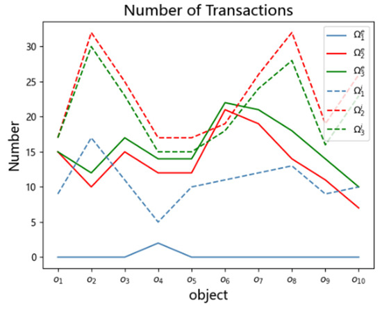 Some of the results of the element fuzzy correlation degree calculation are shown in Table 5. When the benchmark scale was Ω1, it can be obtained from Figure 11 that only o4 transactions with explicit information existed; thus, there was no explicit correlation between the objects. All correlations between objects were implicit. When the benchmark scale was expanded from Ω1 to Ω2, some of the implicit and irrelevant transactions had explicit correlation, and the explicit and implicit correlation index changed at the same time. When it was increased to Ω3, more implicit correlations were transformed into explicit ones. Each object was affected by a different proportion of data, and thus its explicit and implicit fuzzy correlations changed.