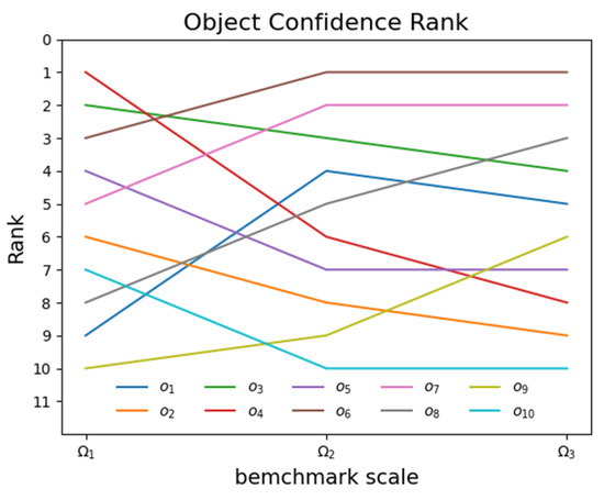 Figure 13 illustrates the impact of the benchmark scale on the ranking of each object. It is evident that the ranking of objects is influenced not only by the spatiotemporal confidence level but also by the chosen benchmark scale. Modifying the benchmark scale allows the alteration of the spatiotemporal confidence ranking of objects, thereby presenting new potential options that could prove valuable for specific problems.