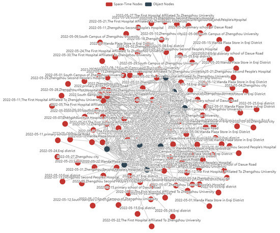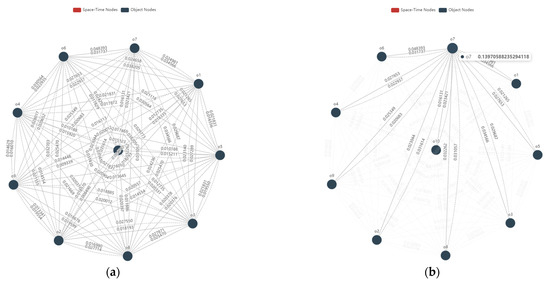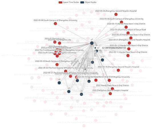 The spatiotemporal attributes encompass the spatiotemporal information of each object, serving as the foundation for establishing correlations between objects. For a more comprehensive understanding of object-specific spatiotemporal information, additional spatiotemporal data selected based on spatiotemporal conditions can be incorporated into the knowledge graph. The results obtained are depicted in Figure 15, where the red circles represent spatiotemporal attributes. The connections between objects and spatiotemporal attributes derived from the data are depicted as solid lines, forming the basis of spatiotemporal information. Moreover, by focusing on individual objects, as demonstrated in Figure 16, users can gain detailed insights into the object’s spatiotemporal characteristics. The spatiotemporal knowledge graph effectively facilitates rapid comprehension of other objects related to the object of interest and their co-existing spatiotemporal attributes, ensuring readability and visualization.
