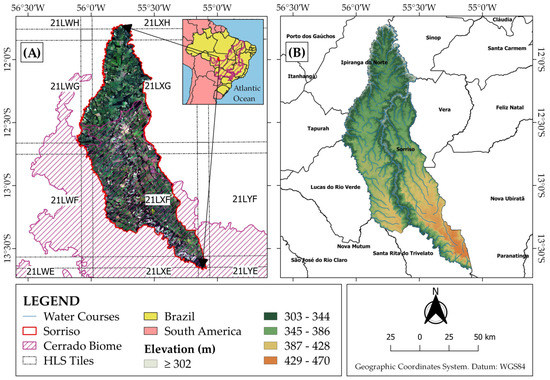 (A) Location of the study area, which corresponds to the municipality of Sorriso in the Brazilian tropical savanna (Cerrado) and Mato Grosso State, Brazil. (B) Digital elevation model of the study area obtained from Copernicus DEM GLO-30: Global 30 m using the Google Earth Engine. Sources: territorial boundaries [29]; Cerrado boundaries [30]; HLS tiles [31]; water courses [32].