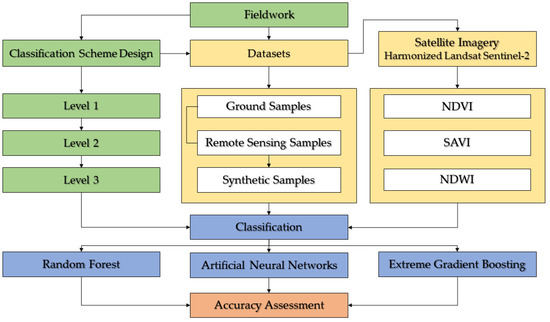 The main steps of our methodological approach were (i) fieldwork for the selection of samples; (ii) creation of synthetic samples; (iii) elaboration of the hierarchical classification scheme; (iv) obtaining the HLS data set and generating spectral indices; (v) training ML algorithms for classification; and (vi) accuracy assessment (Figure 2).