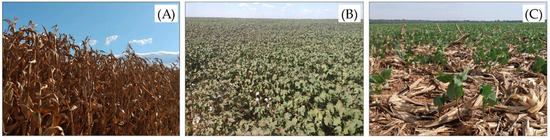 Field panoramic photos obtained in early June 2022 showing the general stage of development of corn (A), cotton as the second crop (B), and irrigated beans as the third crop (C).