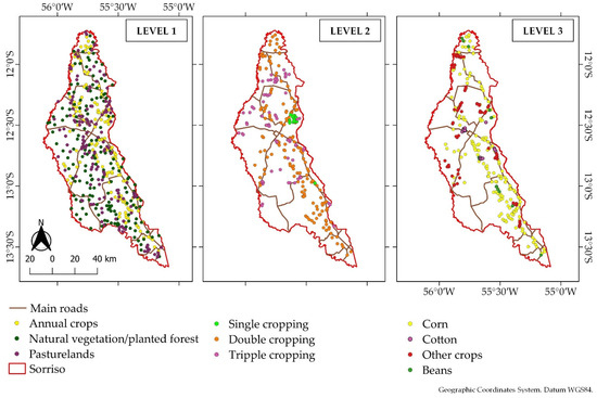 Final maps using the most accurate models at levels 1 (RF-NDVI), 2 (XGBoost-NDVI), and 3 (XGBoost-NDVI).