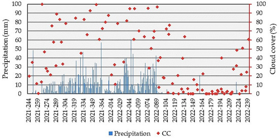 Daily precipitation (mm) obtained from the Climate Hazards Group InfraRed Precipitation with Station (CHIRPS). Data are available in the Google Earth Engine (GEE) platform, and average cloud cover (%) was estimated using Harmonized Landsat Sentinel-2 images in the municipality of Sorriso, Mato Grosso State, Brazil.