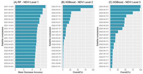 Figure 7 shows the ranking of importance of the variables that best explained the variations of the LULC classes selected in the training phase in terms of overall percentage and MDA. Our data sets were composed of 102 overpasses; however, we selected the 20 most important ones for further analysis, and at all levels, more than 80% of the most relevant images were from the dry period (April to September).
