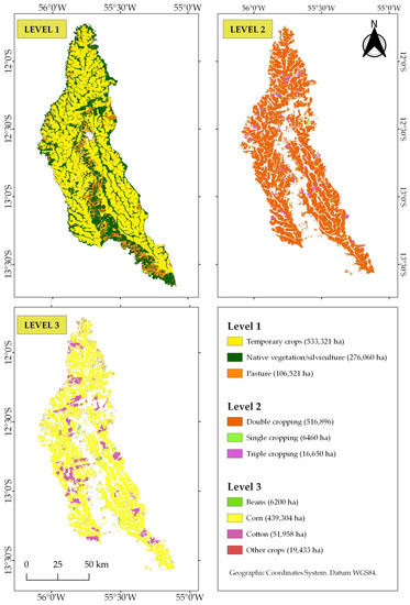 In the level 1 classification procedure, we differentiated the study area into areas containing (i) temporary crops, (ii) natural vegetation and planted forests (or silviculture), and (iii) pasturelands. Planted forests were mapped together with the natural vegetation because of their low occurrence in the study area. Then, we divided the temporary crops based on the number of cycles, including single, double, or triple cropping (level 2). Sugarcane was classified as a single crop, while triple cropping was exclusively observed in center-pivot irrigation systems, mainly with beans as the third-season crop. Although all triple cropping was related to center pivots, not all center pivots were related to triple cropping. Finally, at level 3, double cropping areas were categorized into corn, cotton, beans, and other crops, that is, mainly sorghum and millet. These crops were grown in the second season, mainly following the soybean harvest.