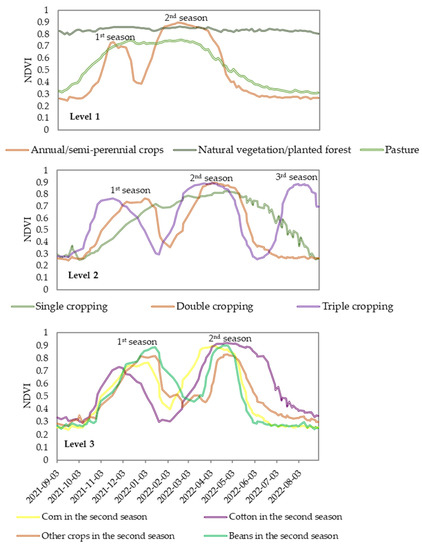 Median HLS NDVI time series for levels 1, 2, and 3 between September 2021 and August 2022, indicating the occurrence of the first, second, and third crop seasons for agricultural areas with more than one cycle. Level 3 exhibits the entire crop season NDVI signature; however, only the second season profiles refer to the target crops: corn, cotton, beans, or other crops.