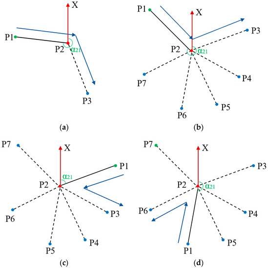 For the ordinary inflection point shown in Figure 3a, the nodes at and create a point vector along the centerline on the left side of the unidirectional model, and the modeling path directly extends to . When the intersection point is the intersection of complex branches, the modeling path starts from point to point . For the remaining node vectors from (i.e., , ), the coordinate azimuth values (i.e., , , , and in the azimuth set A are calculated. At the same time, the coordinate azimuth of the opposite vector of vector is included into the azimuth set A, and the azimuth values in A are sorted. The ordering of the azimuth angle in A can result in three cases, as shown in Figure 3b–d. Figure 3b shows the situation where the azimuth angle is maximal in A. In this case, P3 should be selected as the next unidirectional modeling node to ensure the correct construction of the unidirectional model of the tunnel; that is, has the smallest azimuth angle and should be selected, such that the corresponding vector is the extension direction of the modeling path. Figure 3c shows the case where the azimuth angle is minimal in A. In this case, the vector , whose azimuth angle is just larger than , should be taken as the extension direction of the modeling path. Figure 3d shows the case where the magnitude order of azimuth is neither maximal nor minimal in A. In this case, the orientation should be the modeling extension direction, as the azimuth angle of this vector is just larger than .