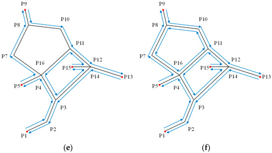 (7) Path extraction for closed loop modeling. The unidirectional and bidirectional unmodeled arcs obtained in step (5) form several closed polygons in the tunnel network, and all independent closed polygons are extracted by using the left-turn algorithm directly [34]. The directed modeling path for each closed tunnel is formed by ordering the vertices of each polygon clockwise, as shown in Figure 5d.
