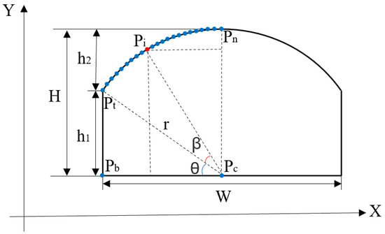 In Figure 6, is the wall height, is the arch height, H is the total height of the tunnel, W is the width of the tunnel, r is the radius corresponding to the top of the arc, is the known centerline coordinate (corresponding to a node of the tunnel centerline network in the CAD drawing), is the bottom point of the left wall of the tunnel, is the top point of the left wall of the tunnel, and is the vault point of the tunnel. The radian value of is expressed as θ, and the radian value of is expressed as β. refers to each point on the arc top of the tunnel, which is usually formed by multi-line segment fitting in computer graphics, where i refers to the number of arc points in a single arch of the tunnel section. The larger the value of i, the higher the precision, which can be set according to the actual rendering requirements. In order to ensure that the 3D tunnel model is consistent with the real tunnel section structure, the tunnel width W, wall height and arch height of the tunnel section are set according to the actual tunnel section. The calculation formulas for each tunnel section point are as follows: